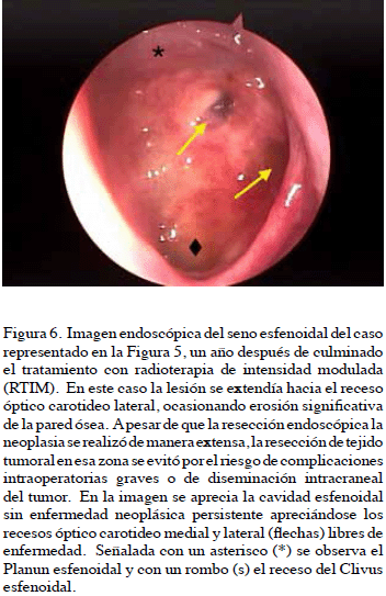 La resección quirúrgica endoscópica en estos casos representa un importante desafío, por los riesgos potenciales de complicaciones intraoperatorias serias y de diseminación tumoral extrasinusal (66).
