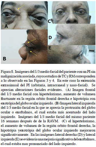 En un paciente con 11 meses de tratado, hasta la fecha de la elaboración de este trabajo, que presentaba enfermedad bilateral extensa con infiltración intraorbitaria, intracraneal y de tejidos blandos naso-faciales, manifiesta anosmia. En este caso la extensión agresiva del tumor había ocasionado proptósis, hipotropía y exotropía ocular, hipertelorismo y abombamiento en la región naso-frontal. Todas estas repercusiones disminuyeron dramáticamente después a las 16 semanas del tratamiento con RTIM. (Figura 8C, 6D y 6E).