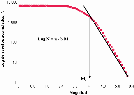 donde N es el número de eventos con magnitud igual o mayor que M, y a y b son parámetros que describen la sismicidad regional. La Figura 1 representa gráficamente la relación de recurrencia, donde Mc es la magnitud de completitud o magnitud mínima de reporte homogéneo durante un período de tiempo, a partir de la cual los datos pueden representarse por una línea recta cuya pendiente es b.