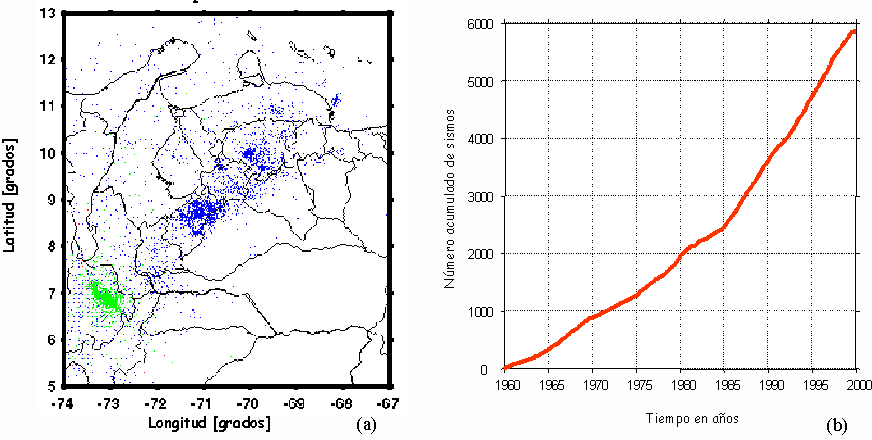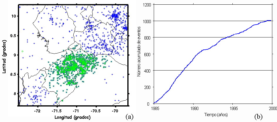 Figura 8. (a) Sismicidad del Estado Mérida entre 1985 y 2000, (b) Gráfica de eventos acumulados versus tiempo para los datos del Estado Mérida entre 1985 y 2000