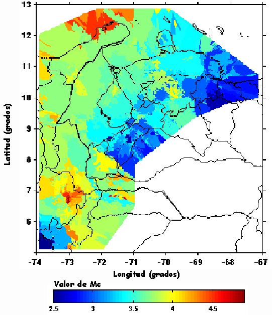 La heterogeneidad de los valores de Mc es considerable en algunas áreas y cambia en un grado de magnitud sobre distancias menores de 60 km. La magnitud de reporte varía desde un valor de 2.5 en el interior del Estado Mérida, núcleo en la cobertura de la red sismográfica de la región, hasta un valor superior a 4 en el Nido de Bucaramanga, límite de cobertura de la red venezolana. Una extensa área se ubica dentro de 3.5 a 4.0, siendo el promedio general para toda la región de 3.7, considerando los últimos cuarenta años de registro. Estos valores relativamente altos de Mc y la alta dispersión presente en la región, representan un aspecto importante en la evaluación de fuentes sísmicas para un estudio de amenaza, ya que la selección de áreas con diferencias apreciables en la Mc, conlleva una desviación en la pendiente de la DFM y por ende una modificación en las tasas y tiempo de recurrencia.