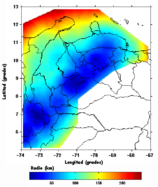 La Figura 4 muestra el radio de resolución necesario para incluir 100 eventos alrededor de cada nodo de la malla, durante el período comprendido entre 1960 y 2000. Este valor es una función del espacio e inversamente proporcional a la densidad local de eventos: áreas con alta densidad de sismos resultan en un cilindro más pequeño que áreas con baja sismicidad. La resolución alcanza 50 km en los Estados Táchira, Mérida, Trujillo, Lara, Yaracuy y en la zona central del Estado Falcón. La mejor resolución se tiene en 20 km en la ciudad de Mérida, Estado Mérida; alrededor de El Tocuyo, Estado Lara y en el Nido de Bucaramanga. En estas zonas se concentra la mayor densidad de eventos en la región. La resolución se incrementa por encima de 100 km en buena parte del Estado Zulia, en el Estado Carabobo, en la Península de Coro, en la serranía de Perijá y hacia el Mar Caribe.