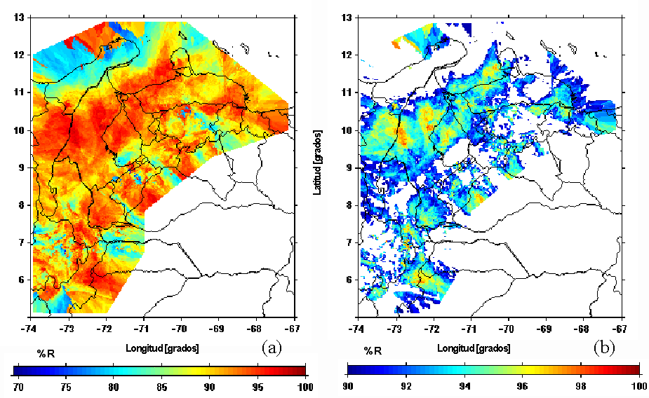 Figura 5. Mapa de valores residuales R, (a) considerando todos los valores de R, (b) considerando los valores de R superiores al 90% satisfactorio