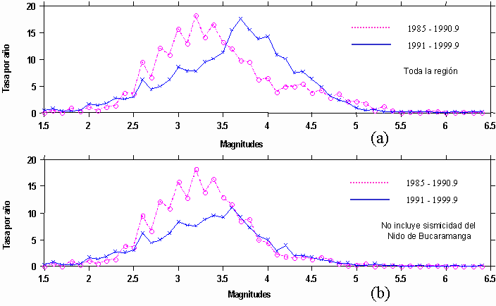 Figura 7. Tasas de sismicidad anual entre 1985-1990.9 y 1991-2000. (a) Para toda la región en estudio, (b) Para toda la región excluyendo los eventos asociados al Nido de Bucaramanga