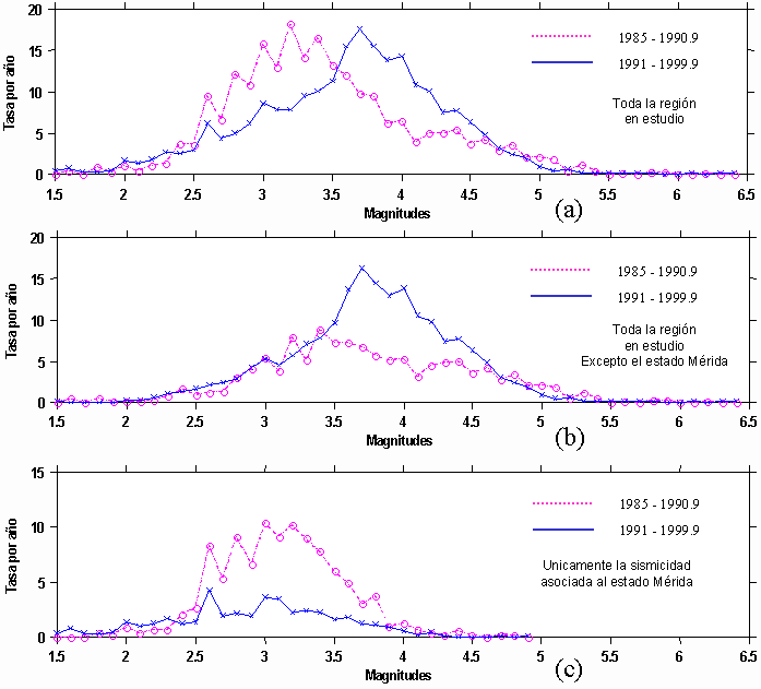 La Figura 9(c) muestra como durante el período de 1985-1990.9 se registraron en Mérida sismos entre una magnitud de 2.5 y 3.5 que no aparecen registrados para el período de 1991-2000. Si se acepta como válida la Ley de Gutenberg y Ritcher, que establece una producción de sismos "constante" con el tiempo, entonces estos eventos han debido ser generados y debidamente registrados.