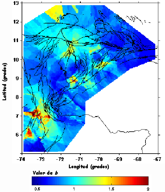 Los resultados se muestran en la Figura 10 donde se calculan los valores de b utilizando el método de mínimos cuadrados. Puede verse la dispersión que se tiene en buena parte de la región estudiada. Sobre parte de la traza de la falla de Piedemonte occidental aparece una zona donde se tiene un valor bajo de b (centro en las coordenadas: longitud 71.38W, latitud 8.83N), rodeado de una zona de valor alto de b. Mientras en el resto del Estado Mérida, se observa una distribución mas o menos uniforme de b. En los límites de los Distritos Torres y Morán del Estado Lara (centro en las coordenadas: longitud 70W, latitud 10N), aparece un área que contiene un círculo de 22 km de radio con un valor de b más bajo que el área circundante. La zona del Nido de Bucaramanga contiene los valores más altos de b que superan un valor de 1.5 (la escala fue recortada para mostrar únicamente hasta 2.0 y permitir mejor resolución en la figura). Esta área se concentra en un cuadrante definido por las coordenadas: longitud -72.45W a -73.74W y latitud 6.23N a 7.40N.