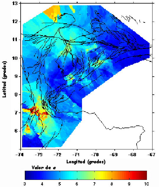Un mapa de la distribución espacial de valores de a (Figura 11), muestra un patrón similar al de valores de b. En el Nido de Bucaramanga se tienen los valores más altos de a, que alcanzan entre 7 y 10, y sobre la falla de Piedemonte Occidental, aparece el mismo sector anómalo con los valores más altos de a en toda la zona andina.