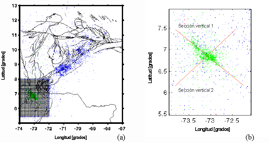 La Figura 12 muestra la zona seleccionada para el análisis de distribución tridimensional de valores de b en el Nido de Bucaramanga. El área rectangular se delimita por las coordenadas geográficas: longitud: -74W a -72W y latitud: 8N a 5.5N. Se considera una malla horizontal con separación entre nodos de 0.075 grados y una malla en vertical con separación de 5 km hasta 250 km de profundidad (Figura 12a). Se toman dos planos verticales que cruzan el área en sentido N45°E y N45°W (Figura 12b) y tres planos horizontales ubicados a 40, 160 y 250 km de profundidad para visualizar la distribución espacial de los valores de b.