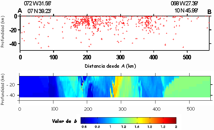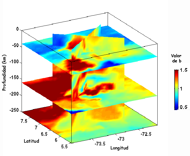 Los resultados se muestran en la Figura 13, donde se aprecia como los valores de b varían también de acuerdo a la profundidad. Los mayores valores tienden a ubicarse hacia profundidades superiores a 100 km y se concentran sobre un área rectangular que delimita la ubicación epicentral de los sismos más profundos. Esta particularidad en la distribución con la profundidad de los valores de b en el Nido de Bucaramanga obliga a considerar dos patrones diferentes de generación de sismos en la zona, lo cual conlleva distintas propiedades de ocurrencia.