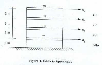 Para verificar la viabilidad de las dos metodologías de estimación de la rigidez y la flexibilidad, desarrolladas anteriormente se realizó una simulación numérica para un edificio aporticado de 4 pisos. Se consideró un modelo con columnas infinitamente rígidas axialmente y planta infinitamente rígida, obteniéndose bajo estas condiciones un modelo de un grado de libertad por planta; el modelo considera masas concentradas en la losa. En la figura 1 se presenta el modelo, detallándose en éste la variación de las inercias de cada piso.