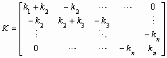 Para estructuras aporticadas en las cuales el comportamiento predominante es a corte, en la mayoría de los casos se consideran losas infinitamente rígidas en su plano y columnas infinitamente rígidas axialmente, con masas concentradas en las losas. Considerando estas hipótesis se puede, a partir de un análisis de cargas previo, determinar la matriz de masa diagonal y una matriz de rigidez bandeada, donde los términos de ésta dependerán de la rigidez de cada piso, tal como se muestra a continuación: