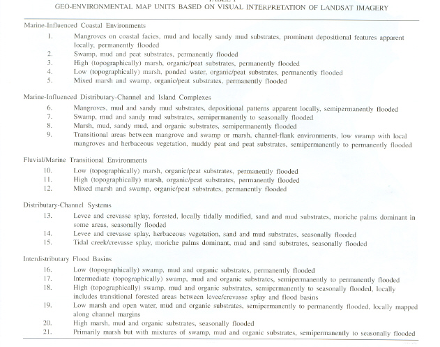 The interdistributary-basin system is the most extensive system in the map area (Figure 2). Mapped environments include three topographically varying swamps, two marshes, and a mixed marsh and swamp class (Table I). Topographically-high, -intermediate and -low swamps were delineated on the basis of variations in imagery reflectance, which are influenced by relative heights of the land surface (topographic setting), flood regime and associated vegetation. Topographically-low swamps appear to be permanently flooded, intermediate swamps permanently to semipermanently flooded, and high swamps semipermanently to seasonally flooded. Low and intermediate swamps have their broadest distribution 1) in flood basins between Caño Manamo and Caño Pedernales, 2) in the area immediately east of Caños Pedernales and Cocuina, and 3) in the lower delta near the marine-influenced environments. High swamps are more widely distributed in the central part of the map area from Caño Pedernales eastward toward Caño Macareo.