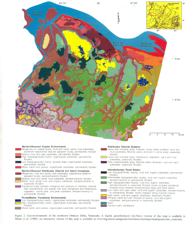 The Orinoco Delta is a dynamic and complex system characterized by relatively rapid geologic and physical changes, which produce modifications in related ecosystems. Dynamic systems are particularly vulnerable to human activities, which can result in degradation of delta ecosystems. Geo-environmental maps in a GIS format help to define and delineate natural resources and thereby assist in the prudent and sustainable management and use of delta environments.