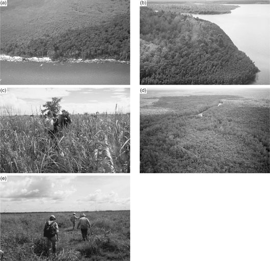 The marine-influenced distributary-channel and island complex is defined in large part by mangroves that are the dominant vegetation on the islands and along the lower reaches of the caños (Figure 3b). This complex has its broadest distribution near the mouths of Caño Manamo and Caño Pedernales, where Isla Manamo is the largest in a series of islands that have formed in Boca de Guanipa Estuary (Figure 1). In more inland areas, the influence of salt and brackish water declines, as does the abundance of mangroves. At Isla Tigre, ~45km upstream from the mouth of Caño Pedernales along Caño Manamo, mangroves cover the seaward tip of the island but upstream intergrade with and are replaced by other types of forest vegetation. Other major occurrences of this mangrove-dominated system are along Caño Pedernales, Caño Cocuina and Caño Capure, where significant stands of mangroves extend upstream along the channels ~45 to 50km from the marine shoreline. Narrow stands of mangroves, too narrow to show on the map, occur along channels much farther upstream than indicated on Figure 2 (Colonnello and Medina, 1998).