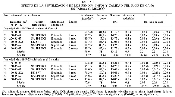 La fertilización tradicional de la caña de azúcar en Tabasco, México, ha consistido en aplicar cada año 120, 22 y 50kg·ha-1 de N, P y K, respectivamente, sin considerar las diferencias en las variedades y tipo de suelo existentes en la zona. Es común que las aplicaciones de fertilizantes se hagan extemporáneamente y en forma superficial por razones operativas y por la escasa disponibilidad de maquinaria para este propósito (Salgado et al., 2000). El rendimiento promedio de la caña de azúcar con este manejo es de solamente 65ton·ha-1 con 6,61ton·ha-1 de azúcar, valores que se consideran bajos comparados con 81ton·ha-1 de caña y de 6,91ton·ha-1 de azúcar, obtenidos por el ingenio Dos Patrias (CNIAA, 1999). Los fertilizantes químicos son una de las mejores opciones para incrementar y mantener los rendimientos de caña y de sacarosa en el corto plazo (Salgado et al., 2001). Pero un desbalance nutrimental, en particular de N (Robertson et al., 1996), aunado a un exceso de humedad en la planta, hacen que la caña no alcance su madurez industrial, ya que la planta utiliza este N para producir nuevo crecimiento (Nickell y Tanimoto, 1968).