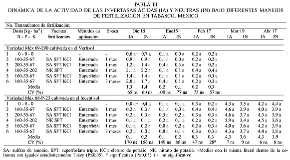 La actividad de las invertasas ácida y neutra no fue afectada significativamente por los tratamientos de fertilización (Tabla III). Las medias en cada muestreo nos indican el comportamiento de estas enzimas en diversos estados de desarrollo de las variedades Méx 69-290 y Méx 68-P-23 (Tabla III). Los coeficientes de variación (CV) de los primeros muestreos fueron muy altos (>60%), indicativo de una elevada variabilidad experimental atribuible a la dinámica de estas enzimas y al método de extracción utilizado, sobre todo en los primeros tres muestreos. Los CV disminuyeron posteriormente (<9,0%). La Méx 69-290 presentó mayor actividad de las invertasas ácida y neutra en el mes de diciembre (Tabla III), lo cual fue atribuido a su menor grado de madurez. Este fenómeno se asoció con altos contenidos de fructosa y glucosa en el tallo, donde son acumuladas para promover el crecimiento, tal como lo indican Venkataramana y Naidu (1993) y Robertson et al. (1996). Sin embargo, la actividad de esas enzimas disminuyó en enero y febrero, probablemente favorecida por la alta retención de humedad en el Vertisol, lo que retrasó el proceso de sazonado en aproximadamente un mes. Por el contrario, en Méx 68-P-23 la actividad de las enzimas fue menor y con mayor valor de ºBrix al inicio (diciembre), lo que indica que el proceso de sazonado estaba avanzado. En febrero la actividad enzimática y los ºBrix fueron similares en ambas variedades, ya que las condiciones del clima favorecieron el proceso de madurez. Sehtiya et al. (1991) reportaron en el jugo de caña actividades de las enzimas menores a 1,0mg (glucosa)·ml-1·h-1 en la parte central del tallo de caña de 10 meses de edad, lo que coincide con los datos obtenidos en febrero en el presente estudio. En marzo y abril, la Méx 68-P-23 mostró un incremento en la actividad de ambas invertasas, que se asoció con el aumento de ºBrix (Tabla II). Estos resultados no concuerdan con los reportados por otros autores (Sehtiya et al., 1991; Thom y Maretzki, 1992; Dhamankar et al., 1993) quienes observaron un aumento en la actividad de la invertasa neutra y una disminución de la ácida en la etapa de maduración, que se asoció con una elevada concentración de sacarosa. En el presente estudio ambas variedades mostraron una actividad irregular de las invertasas, similar a lo observado por Venkataramana et al. (1991) en cultivares de alto contenido de sacarosa.