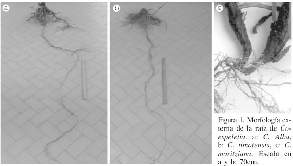 La Figura 1 muestra parte de la morfología externa de las raíces de Coespeletia alba (a) y C. timotensis (b) con un sistema radical holorrízico con ramificaciones que alcanzan más de 2,5m y profundidad de hasta 80cm, y las raíces de dos especímenes de C. moritziana (c) que se encuentran conectadas o unidas. El sistema radical de estas plantas es poco desarrollado y éstos son los únicos ejemplares con esta característica.