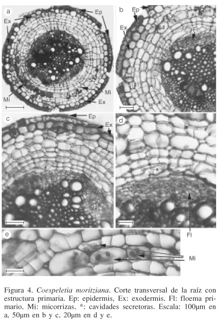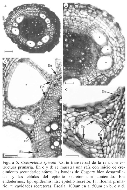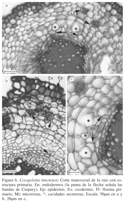 The morphology and primary root structure of the species Coespeletia Cuatrec. that grow in the mountains of Piedras Blancas and Sierra Nevada, Mérida, Venezuela, are shown. The species are Coespeletia alba, C. lutesecens, C. moritziana, C. spicata and C. timotensis. The presence of common characters such as monostratified epidermis that is rapidly replaced by the exodermis, presence of secretory cavities associated to the endodermis and the secretory nature of endodermis, were detected. Differential characters were detected as well, such as cortex structure, number of primary xylem arcs, and number of cavities occurring opposite the phloem.