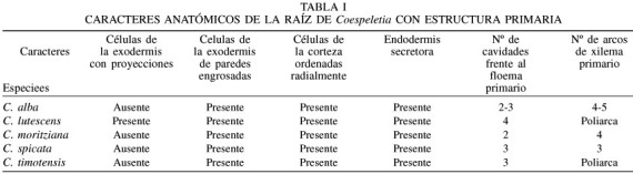 Foi feito um estudo da morfologia e a estrutura primária das raízes das espécies de Coespeletia Cuatrec. que crescem nos páramos de Piedras Blancas e Sierra Nevada, Merida, Venezuela: Coespeletia alba, C. lutesecens, C. moritziana, C. spicata, e C. timotensis. Detectou-se a presença de caracteres comums a todas como epiderme uniestratificada que rapidamente é substituida pela exoderme, presença de cavidades secretoras associadas à endoderme e a natureza secretora da endoderme. Também detectou-se a presença de caracteres diferenciais como estrutura do córtex parenquimático, número de arcos do xilema e número de cavidades em frente a cada polo de floema.