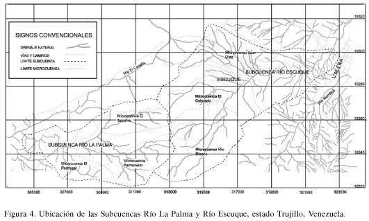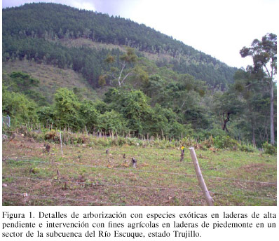 Un ejemplo palpable de este problema de degradación es el sector de la microcuenca Río Blanco, perteneciente a la subcuenca del río Escuque, que drena sus aguas hacia la cuenca del río Motatán. Esta microcuenca representa la principal fuente hídrica que suministra agua al Municipio Escuque desde el año 1960. Durante estos 46 años la misma ha estado sometida a un proceso de intervención que incluye el avance de la frontera agrícola; la deforestación de El Alto de Tomón, lugar de su nacimiento; la sustitución de cultivos ecológicos como el café por cultivos limpios, llevando con ello al uso indiscriminado de agroquímicos y agrotóxicos; la destrucción de áreas boscosas por causa de incendios; la sustracción de capa vegetal para uso de viveros establecidos en zonas urbanas; el incremento desordenado de áreas urbanas y con ello descargas de aguas servidas a cielo abierto; los botes de desechos sólidos en lugares inapropiados, comprometiendo la calidad de vida de las comunidades; y las vías de penetración sin ningún criterio conservacionista. Todo esto afecta la capacidad productora de agua de esta microcuenca, así como la calidad fisicoquímica y bioquímica de sus aguas (Figura 1).