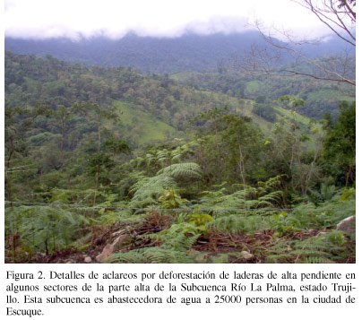 Por su parte, la microcuenca El Socorro, localizada en la subcuenca del río La Palma, que aguas abajo alimenta al río Buena Vista, es la fuente hídrica que, desde el año 2004, aporta un complemento significativo de agua para el acueducto La Palma que, por trasvase, es conducida a las áreas urbanas del municipio Escuque. Estos espacios han sido ocupados por comunidades tradicionalmente productoras de café (Coffea arábica), que a raíz del deterioro de sus cosechas por efectos de la broca (Hypothenemus hampei), se han visto en la obligación de cambiarlos por otros cultivos. Adicionalmente, se ha observado un cambio de uso agrícola de la tierra a través de la incorporación de cultivos limpios, deforestación en zonas de fuertes pendientes, extracción de madera, anillado de árboles, tala de áreas boscosas protectoras, cría de animales porcinos y bovinos, así como el vertido de aguas servidas que van directamente a la quebrada, comprometiendo la calidad del agua; igualmente se observa que el acondicionamiento de la vialidad ha convertido estos espacios en un atractivo que pudiera, a corto y mediano plazo, representar una amenaza si se llegaran a desarrollar actividades no controladas (Figura 2).