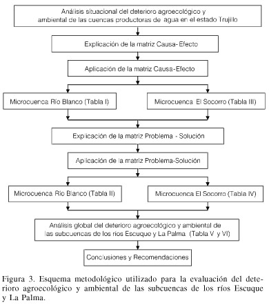 En la Figura 3 se presenta un flujograma que resume las actividades cumplidas durante la aplicación de la metodología multifactorial y participativa para evaluar el deterioro agroecológico y ambiental de las dos microcuencas antes referidas, cuya ubicación se muestra en la Figura 4.