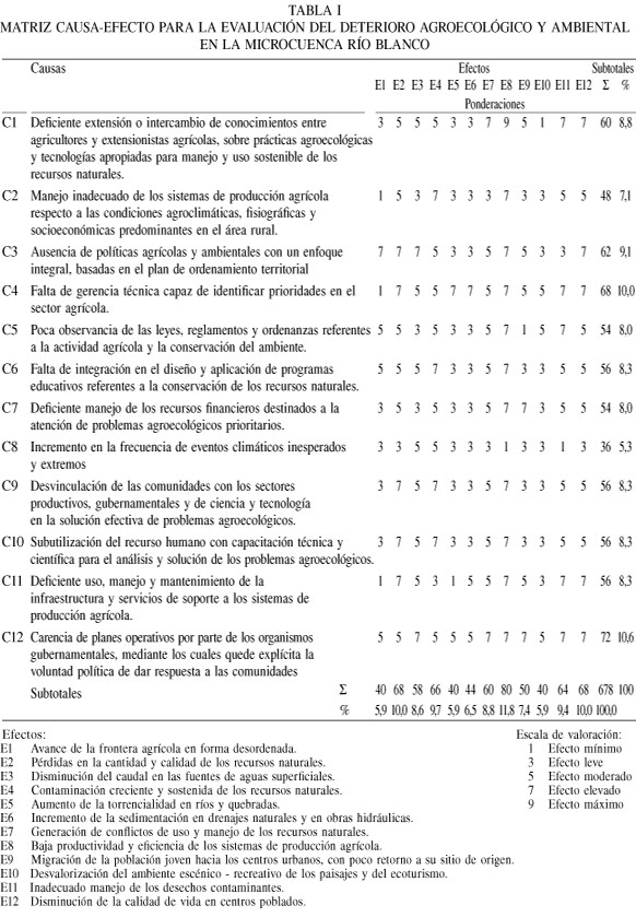 De acuerdo con los resultados presentados en la Matriz Causa-Efecto (Tabla I) se pudo determinar que el orden de importancia bajo el cual inciden las doce causas que fueron identificadas por los integrantes del grupo evaluador, como determinantes del deterioro agroecológico y ambiental de dicho sector, siguen la secuencia decreciente C12>C4>C3>C1>C6=C9=C10=C11>C5=C7>C2>C8.