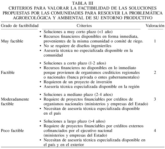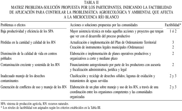 Con base en los resultados obtenidos, los participantes del taller propusieron un conjunto de acciones dirigidas a controlar las causas específicas que están provocando la manifestación de los problemas o efectos antes puntualizados. En Tabla II aparecen indicados, para cada uno de los problemas, las acciones o soluciones propuestas durante el taller y la factibilidad de aplicación para las condiciones del sector que está en el área de influencia de la microcuenca Río Blanco.