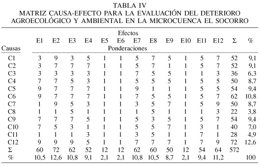 En la Tabla IV se indica la valoración dada por los miembros de la comunidad que asistieron al taller. Allí quedó expresado el nivel de importancia de las principales causas que fueron identificadas como determinantes del deterioro agroecológico y ambiental de dicho sector. Para este caso, el orden de importancia decreciente de las doce causas es C12>C6>C5=C9>C1=C2>C4=C7>C10>C3>C11>C8