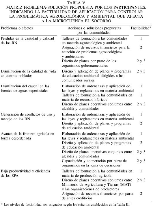 Con base en estos resultados, la comunidad asentada en la microcuenca El Socorro tiene presente la importancia de atender su problemática agroecológica y ambiental a partir de la aplicación de algunas estrategias dirigidas a minimizar las causas que producen estos efectos, para lo que los participantes del taller propusieron un conjunto de acciones que se indica en la Tabla V, junto a la factibilidad de su aplicación.