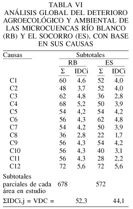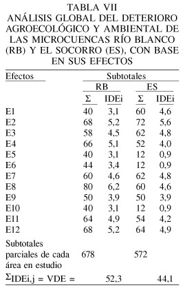 Con fundamento en la matriz Causa-Efecto y aplicando las ecuaciones 1 y 2 se determinó que la microcuenca Río Blanco exhibe un valor de deterioro (VD= 678), mayor que la microcuenca El Socorro (VD= 572), los cuales con respecto al valor máximo de deterioro (V(max)D= 1296), representan el 52,3 y el 44,1%, respectivamente, como se muestra en las Tablas VI y VII. Estos resultados indican un significativo deterioro en la microcuenca Río Blanco y en menor proporción en la microcuenca El Socorro.