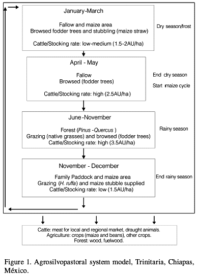 Rotational patterns between agricultural and forest areas, as well as the stocking rate, fluctuate throughout the year. Normally, farmers have a small "estrella" grass paddock near the house, 1 to 2ha of fallow land and 1 to 2ha of maize. Also, they utilize communal forests. Livestock management in forest areas is carried out collectively. Use of fire is restricted to agricultural areas, but nowadays this practice of burning is dying out due to governmental policies.