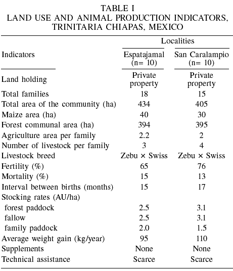In general, livestock system performance shows low production indices compared to intensive high-input management systems practiced in other areas of Chiapas, as well as in other parts of Mexico (Villafuerte et al., 1999; Nuncio et al., 2001). Nevertheless, cattle activity in the region under study is very similar to other low-input systems in Northern and Highland Chiapas (López et al., 2001). Birth interval is very long and calf mortality is considerable, principally during the dry season. In general, the breeding season is not actively managed by farmers, and births are concentrated during the dry season. Health practices and financial assistance are limited. However, farmers tend to use vaccines and vitamins, as there is a common belief that these products are essential to good health. Weight gains average around 100kg per year, and fattening for market takes 2.5-3 years. This system is slow, but assures gains with low investment of capital and other inputs. Moreover, farmers tend to shorten fattening time. Animals are sold in local and regional markets in southern Mexico through intermediaries ("coyotes"). Commercial animal weights range from 250 to 350kg. "Koctan", a tradition of distributing livestock meat among community families for local consumption, is practiced in the region. Additionally, there is a market for draught animals, used for carrying and hauling.