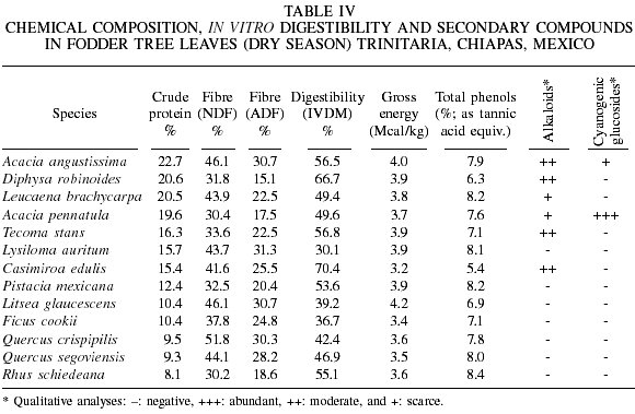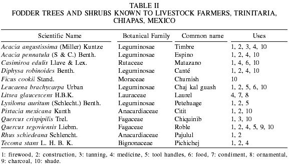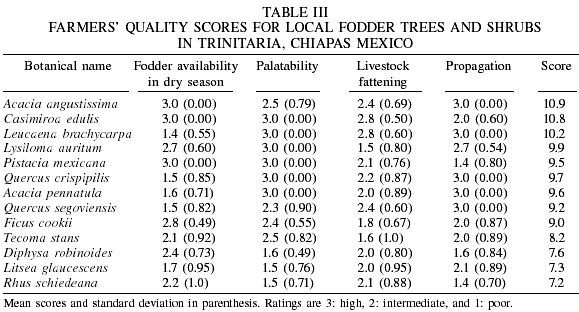 Table III presents farmer perceptions of local fodder trees and shrubs. All species had leaves during the dry season. Nonetheless, farmers especially appreciated the value of A. pennatula, F. cookii, P. mexicana and R. schiedeana for their high amount of foliage during the dry season. These trees, according to farmers, contribute significantly to livestock feeding during this critical period.