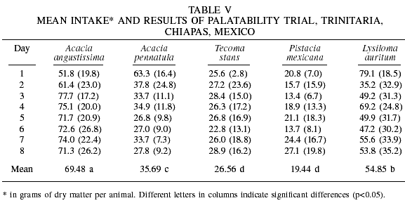 Table V shows how dry matter intake and palatability changed over the course of the eight-day experiment. Results showed variability day to day, and among species. The most palaTable species were A. angustissima and L. auritum. Intake of A. angustissima increased from the initial days of evaluation (r2= 0.38, p<0.05). On the other hand, A. pennatula was found to have a high intake the first day, decreasing subsequently (r2=0.53, p<0.05). The other species did not show significant trends (Table V). Low palatability in A. pennatula, T. stans and P. mexicana could probably be attributed to the combination of moderate digestibility plus the presence of secondary compounds and physical characteristics of the foliage.