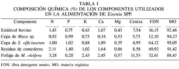 En la Tabla I se muestra la composición bromatológica de los componentes utilizados. Aunque la composición química de un mismo componente puede variar marcadamente con las condiciones en que es cultivado, la época del año y la parte de la planta, en todos los casos los niveles de macroelementos y fracción fibrosa fueron adecuados para la alimentación de la lombriz y coinciden, en buena medida, con la composición de algunos alimentos utilizados con éxito en la cría de Eisenia spp. bajo diferentes condiciones edafoclimáticas (Hernández et al., 1997; Hernández et al., 1999).
