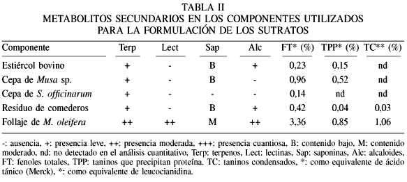 La Tabla II muestra el contenido de metabolitos secundarios en los componentes utilizados para la formulación de los sustratos. Los terpenos (Terp) se detectaron en pequeñas cantidades en todos los componentes, mientras que las lectinas (Lect), las saponinas (Sap), los alcaloides (Alc), los fenoles totales (FT), los taninos que precipitan proteínas (TPP) y los taninos condensados (TC) se encontraron cuantiosamente en el follaje de M. oleifera. En la cepa de Musa sp. los niveles de FT y TPP fueron intermedios, y en el resto de los componentes se consideran bajos. Los resultados obtenidos con la cepa de plátano coinciden con lo reportado por Restrepo et al. (2000) con relación a que el seudotallo de las especies del género Musa también contienen niveles importantes de taninos.