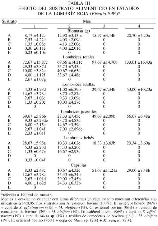 Con relación al comportamiento de los estadios de Eisenia spp. alimentada con los sustratos experimentales, la mayor cantidad de biomasa, lombrices totales, adultas, juveniles y bebés se observaron con el sustrato A en el cuarto mes de muestreo. No obstante, la mayor producción de cápsulas se observó en el tercer mes (Tabla III).