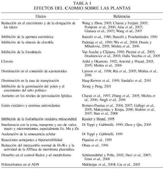 Una vez que los metales se han movilizado, son capturados por las células de las raíces, donde se unen inicialmente a la pared celular de las células epidérmicas para ser luego translocados por intercambio iónico al resto de la planta. Este proceso puede estar mediado por transportadores, como en Oryza sativa (Homma e Hirata, 1984), Zea mays L. (Mullins y Sommers, 1986) y Glicine max (Cataldo et al., 1983), por difusión simple como en Hordeum vulgare (Soloiz y Vulpe, 1996) o por ambas, como en el caso de Triticum turgidum (Hart et al., 1998). Los efectos más notables en plantas expuestas al Cd han sido reseñados por varios autores y se muestran en la Tabla I.