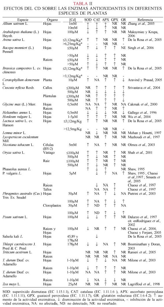 Lagriffoul et al. (1998) consideraron que las medidas de actividad enzimática pueden ser utilizadas como biomarcadores tempranos en bioensayos con plantas que se encuentran en suelos contaminados. De igual forma, De la Rosa et al. (2005) señalaron que la actividad de las enzimas puede ser la base para el monitoreo y la predicción de los efectos de los metales pesados, antes de que ocurran cambios significativos en la estructura natural de las comunidades. La Tabla II resume el comportamiento de varias enzimas en diferentes especies de plantas expuestas a distintas concentraciones de Cd.