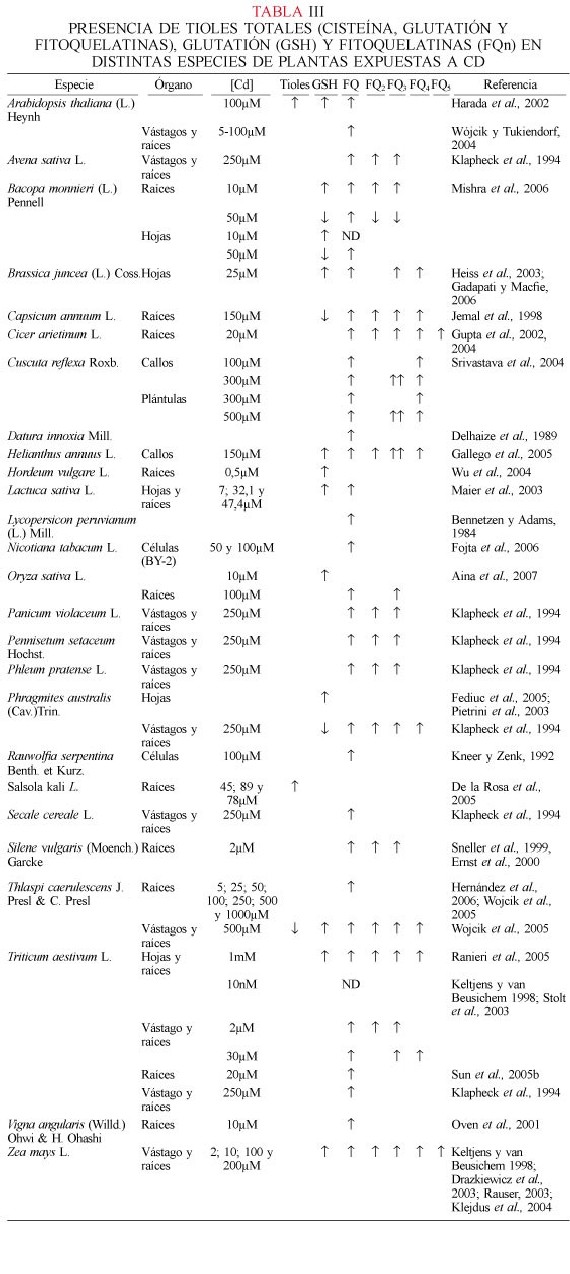 La Tabla III resume las variaciones observadas en varias especies de plantas expuestas a Cd con respecto a la presencia de tioles, glutatión y fitoquelatinas.