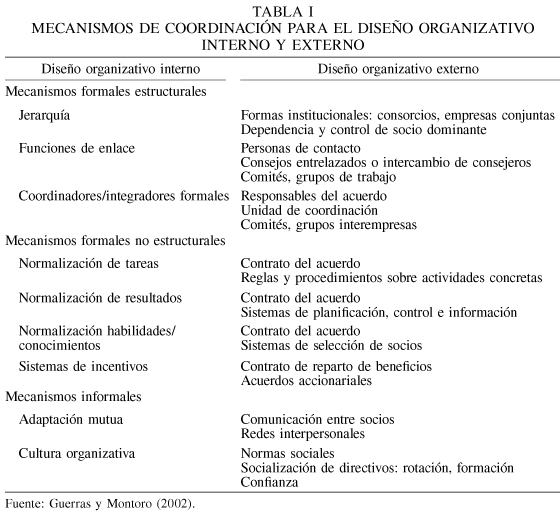 Por ello, se centrará la atención en los mecanismos tradicionales de coordinación, tanto formales, estructurales o no, como informales, y se tratará de adaptarlos al análisis de las relaciones interorganizativas. Tras una revisión de la literatura (Alexander, 1995; Grandori y Soda, 1995; Grandori, 1997; Kumar y Seth, 1998; Guia, 2002; Guerras y Montoro, 2002; Dekker, 2004) se analizarán los principales mecanismos de coordinación para el diseño organizativo externo (Tabla I), distinguiendo entre mecanismos formales e informales y, dentro de los primeros, entre los que implican la creación de órganos específicos (estructurales) y otros que no comportan tal creación (no estructurales).
