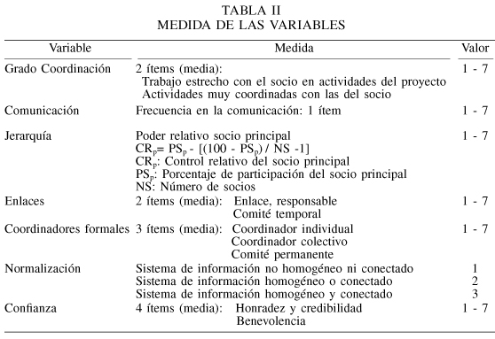 La Tabla II recoge de forma resumida la medición de las variables. Se utilizaron dos variables diferentes para medir la coordinación de los acuerdos de cooperación: el grado de coordinación y los mecanismos de coordinación. Esta dualidad de variables se fundamenta en la idea puesta de Lawrence y Lorsch (1967) de que distintas empresas pueden obtener niveles de integración similares a partir de una combinación de medios o mecanismos muy diferentes. Así, el grado de coordinación entre los socios se ha medido utilizando dos ítems valorados en un rango de uno a siete, tras consultar los trabajos de Mohr y Spekman (1994) y Linden et al. (1997). Para representar los mecanismos de coordinación y de acuerdo con la fundamentación teórica desarrollada en el apartado anterior, en este estudio se consideran tanto mecanismos formales (jerarquía, enlaces, coordinadores formales y normalización) como mecanismos informales (adaptación mutua entendida, por un lado, como comunicación y como confianza, por otro).