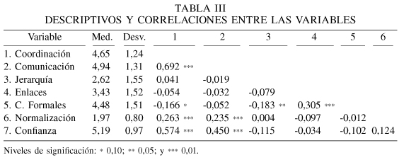 En este apartado se presentan los principales resultados obtenidos con un propósito básicamente descriptivo. Primero se presentan los resultados de los estadísticos descriptivos referentes a cada una de las variables del análisis, tanto el grado de coordinación como los distintos mecanismos considerados, y luego se exponen las correlaciones entre las variables para poder inferir de forma aproximada la utilización combinada de distintos mecanismos en un mismo acuerdo. La Tabla III muestra los resultados de la media y la desviación típica de cada una de las variables, así como las correlaciones entre ellas.