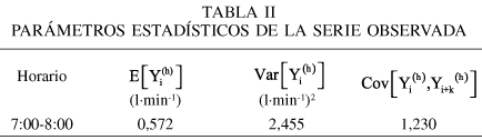 Considerando las Ecs. 10, 11, 12 y 17 para los parámetros teóricos y tomando los valores calculados en la Tabla II para los parámetros observados, se aplicó programación matemática no lineal (NLP). Los resultados derivados de la optimización aparecen en la Tabla III. Los mismos reflejan que el tiempo promedio entre la ocurrencia de dos eventos entre las 7:00 y 8:00 es de ll-1= 19,20min. Asimismo cabe mencionar que, a diferencia de Alvisi et al. (2003), en la solución del problema de optimización no fue necesario introducir pesos a la función objetivo ni establecer valores fijos a ciertos parámetros, para garantizar valores razonables de los parámetros en la solución óptima.