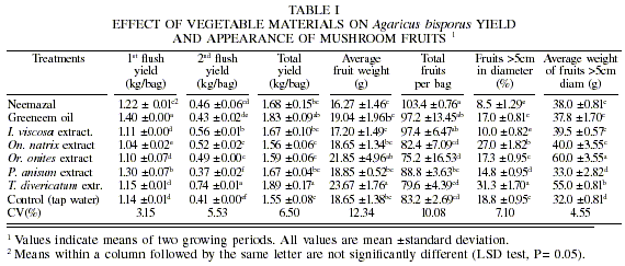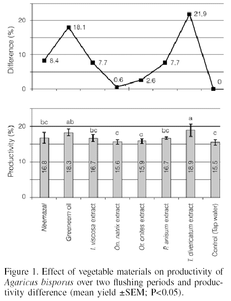 Some previous studies showed that addition of various materials to compost strongly enhanced yields of cultivated mushrooms. For example; Schisler and Sinden (1966) and Schisler (1967) reported that the supplementation of mushroom compost at spawning and at casing with small amounts of vegetable oils and nutrients resulted in increased yield. Schisler and Patton (1970) noted that lipid, specifically linoleic acid, is stimulatory to mushroom production. Furthermore, Royse and Sánchez (2008) indicate that mushroom yields may also be stimulated by supplementation of first break mushroom compost with hydrolyzed protein, commercial supplements and crystalline amino acids. In previous studies (Polat et al., 2008; Erler et al., 2008) for evaluating new materials to control mushroom flies (sciarids, cecids and phorids), some vegetable materials (Neemazal-T/S® and hot water plant extracts of Inula viscosa L. and Origanum onites L.) were found to produce a significant increase in cumulative yields of A. bisporus compared to the control. Therefore, the present study was conducted to evaluate the effect of some vegetable materials, including those mentioned above, on the yield and productivity of A. bisporus.
