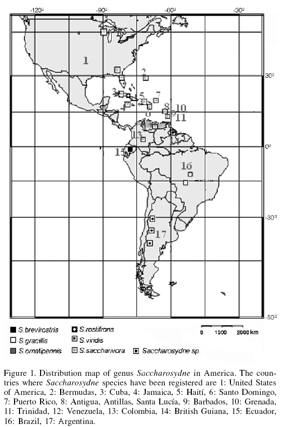 So far, with the exception of two species in Asia, this genus is confined to America. S. brevirostris Muir, 1926, in Ecuador; S. gracillis Muir, 1926 and S. ornatipennis Muir, 1926, in Brazil; S. procerus Matsumura, 1931, in Japan, China, USSR (Maritime and Mainland Territory); S. rostifrons (Crawford, 1914), in Cuba; S. saccharivora (Westwood, 1833), in Antigua, Antillas, Barbados, Cuba, British Guiana, Grenada, Haití, Jamaica, Puerto Rico, Santo Domingo, Trinidad, USA and Venezuela (Guagliumi, 1953; Giraldo-Vanegas et al., 2004, 2005, 2006), Colombia (Gómez and Lastra Borja, 1995), Grenada (Westwood, 1833) and Cuba (Arocha et al., 2005); and S. viridis Muir, 1926, in British Guiana (Figure 1). The collections in Argentina extends to the south the known geographic distribution.