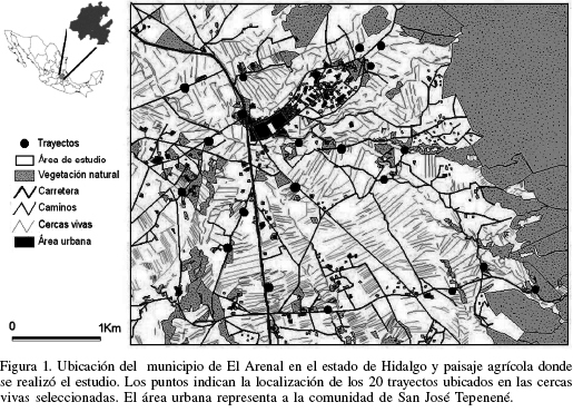 El estudio se llevó a cabo en un paisaje agro-urbano cercano a la comunidad de San José Tepenené, en el Municipio de El Arenal, Hidalgo, en el centro de México, entre 20º15 y 20º08N y entre 98º48 y 98º56O, con una altitud media de 2040msnm (Figura 1). El clima local es templado-frío, con una temperatura media anual de 16°C y una precipitación total anual de 650mm. El periodo de lluvias se presenta de junio a septiembre. La principal actividad económica es la agricultura de temporal, que ocupa el 34,12% de la superficie del municipio, y presenta como cultivos principales el maíz, trigo, cebada, frijol y alfalfa (INEGI, 2002).