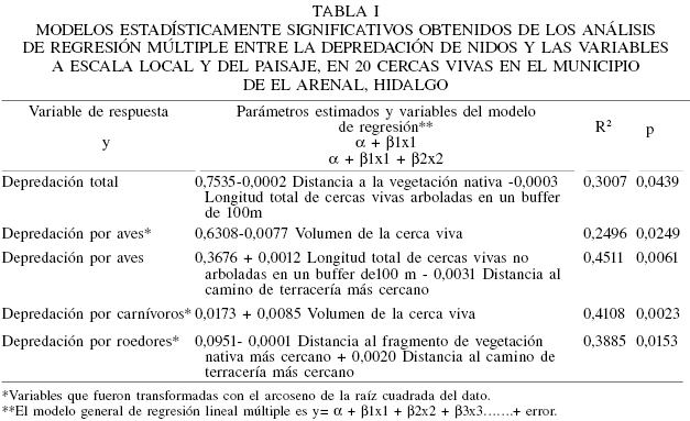 Al analizar los datos de depredación por carnívoros se encontró que a escala local la depredación total aumentó conforme se incrementó el volumen de la cerca viva (Tabla I); es decir, se observó mayor depredación en cercas vivas más anchas y altas. A escala del paisaje no se encontró ninguna relación significativa entre la depredación y las variables analizadas.
