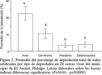 Al analizar los patrones por tipo de depredador se observó que las aves fueron los principales depredadores en el paisaje agro-urbano de El Arenal, patrón que se ha encontrado en otros paisajes fragmentados (Nour et al., 1993; Danielson et al., 1997; Zanette y Jenkins, 2000), así como en paisajes urbanizados (Danielson et al., 1997; Thorington y Bowman, 2003). También se ha visto que los paisajes con muchas cercas vivas, como es el caso de El Arenal, poseen una alta abundancia de aves (Zuria, 2003). A escala local, la depredación por aves estuvo inversamente relacionada con el volumen de las cercas vivas y el número de árboles y arbustos; es decir, las aves al parecer prefieren realizar sus actividades de forrajeo y depredación en cercas vivas más pequeñas y con menor volumen de vegetación, por ser depredadores visuales (Ratti y Reese, 1988) y en estos sitios pueden localizar mejor su alimento. A escala del paisaje, las aves parecen elegir áreas con menor densidad de vegetación para forrajear y áreas cercanas a los caminos de terracería, generalmente relacionados con áreas abiertas. A pesar de que no se identificó a las especies de aves depredadoras de nidos en la zona, es probable que especies como el zanate mexicano (Quiscalus mexicanus) y otros tordos pudieran ser responsables de gran parte de la depredación. Estas aves son abundantes en áreas abiertas, se alimentan en zonas agrícolas, utilizan los árboles de las cercas vivas para perchar y son comunes en el área de estudio. Otra especie que pudiera haber destruido algunos de los nidos artificiales es la matraca del desierto (Camphylorhynchus bruneicapillus), que fuera observada frecuentemente anidando y forrajeando en la mayoría de las cercas vivas estudiadas, y que se ha reportado como una especie que destruye nidos (Stuart y Simons, 1990).
